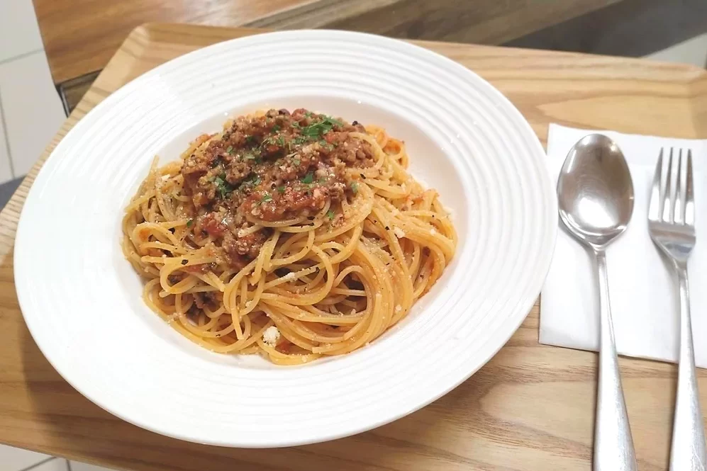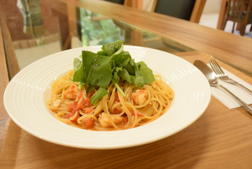濃厚なエビの旨みが凝縮されたトマトソースと風味豊かなルッコラを合わせた当店不動の人気パスタ